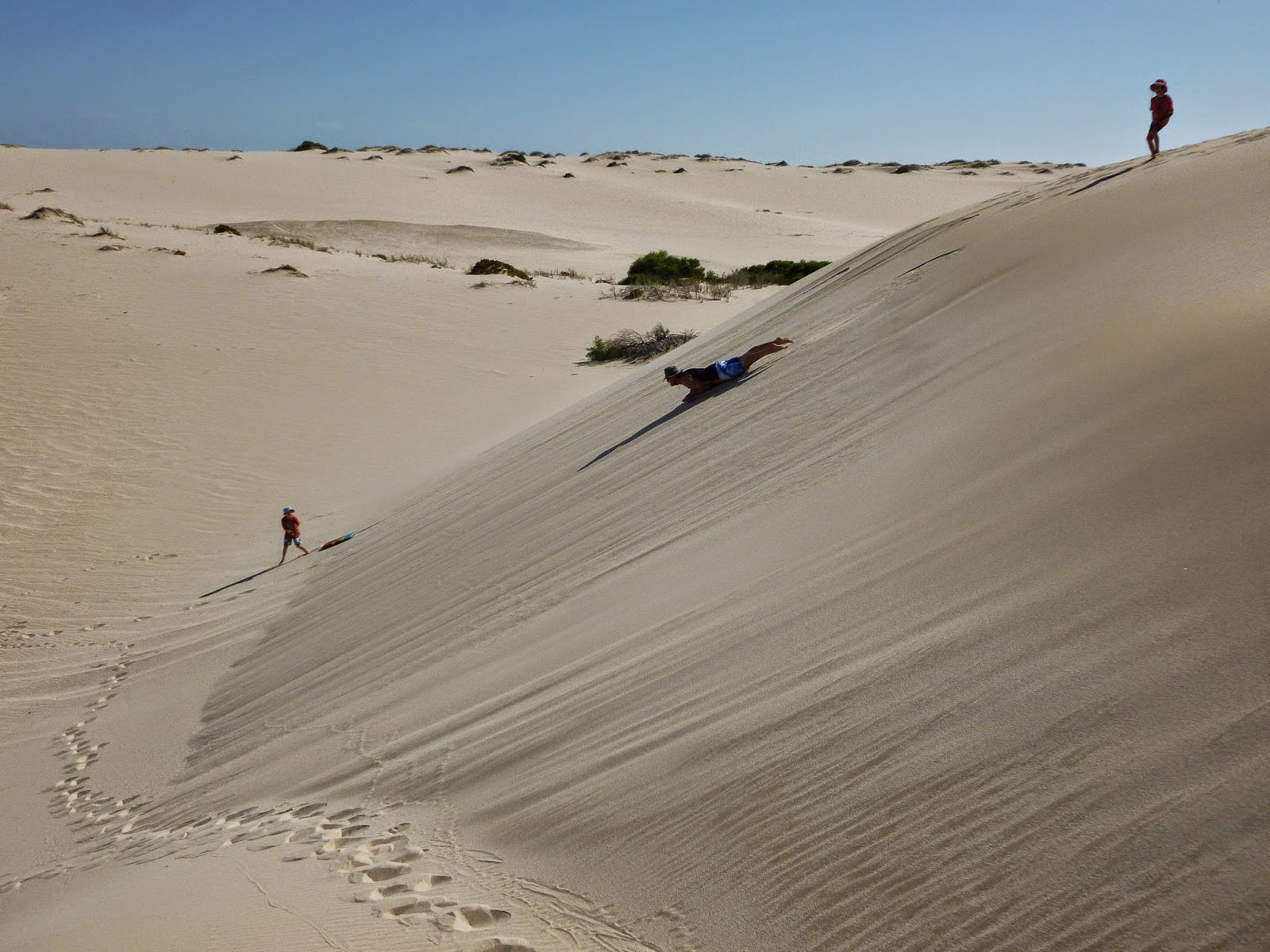 After breaky on the first day we went exploring the beach and the dune areas early as it was forecasted to be in the high 30's. On our way back to camp we found these huge dunes and the boys were keen to give them a go on their boards. Even i gave it a go :)